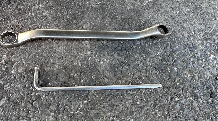 2. 六角レンチで固定しながら、14mmのレンチでナットを外します。リアの注意点: スペースが狭いため、長いメガネレンチだと周囲に干渉することがあります。短いレンチをうまく使い分けましょう。