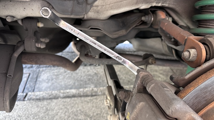 まずはホイールを外し、キャリパーを固定している12mmのボルトを緩めます。RB1のリアはスペースが限られている場所もあるので、メガネレンチとソケットを使い分けるとスムーズです。