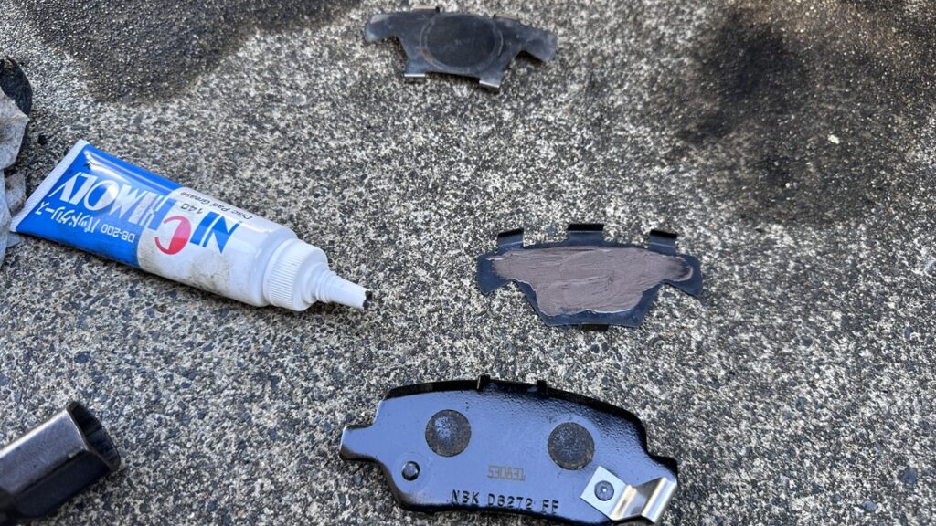 古いパッドからシムを移植し、新しいHAMPパッドを装着します。シムの接触面には薄くグリスを塗布して、鳴き対策も万全に。